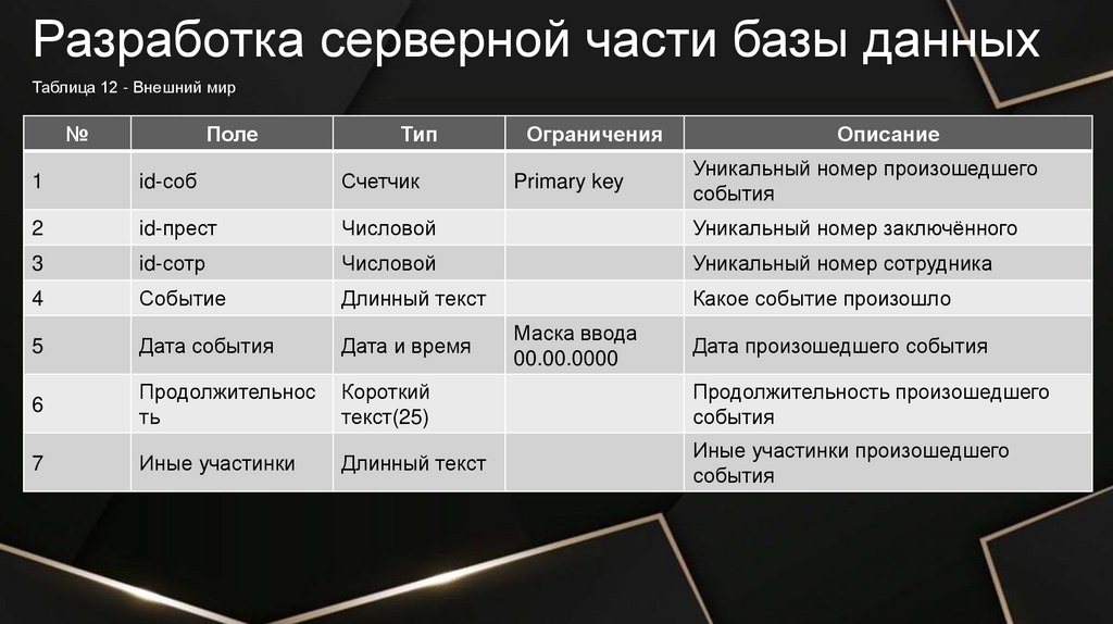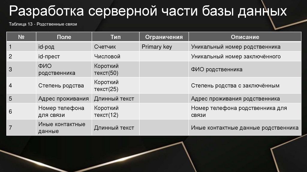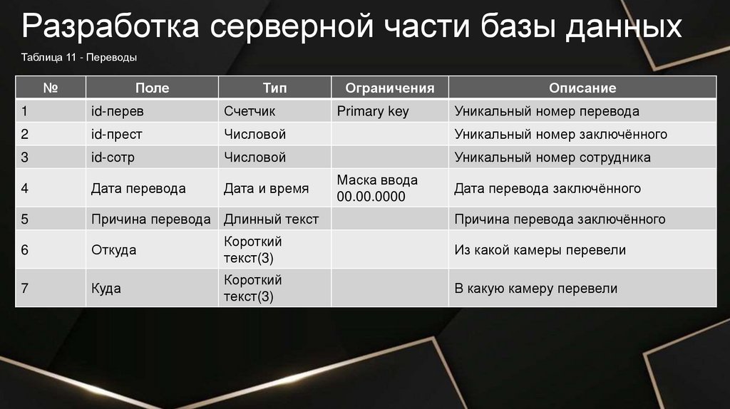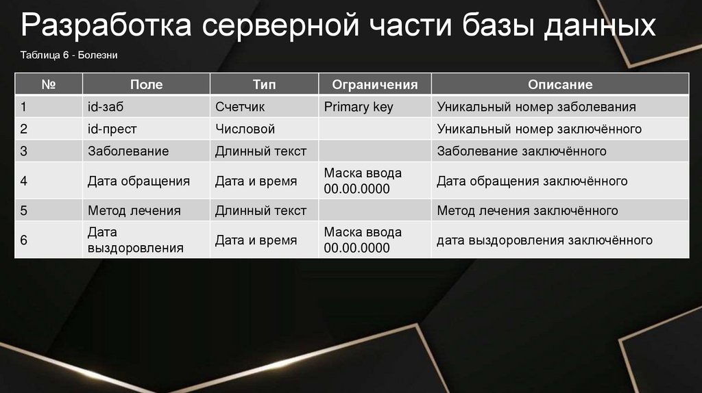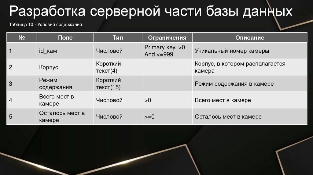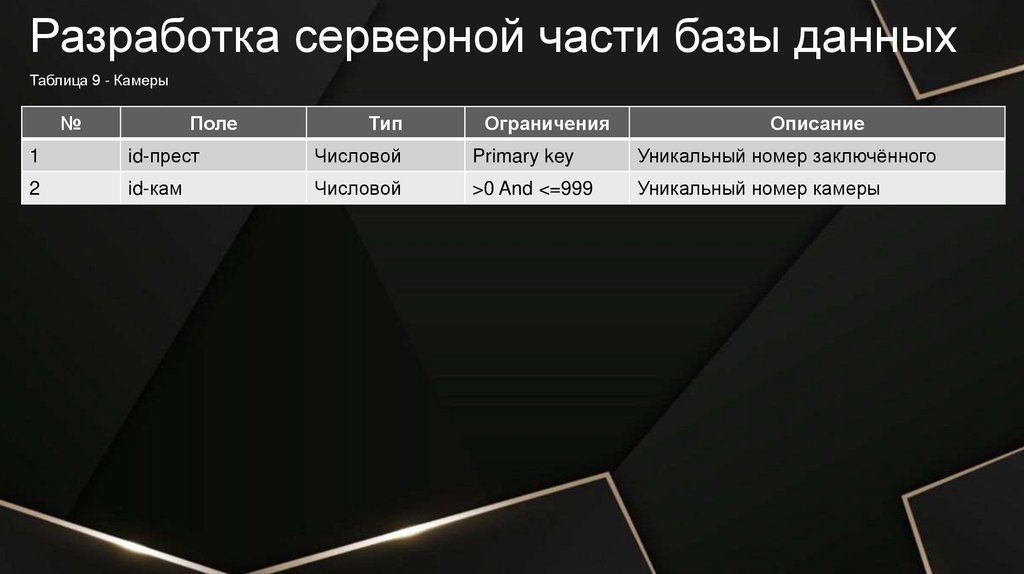 Разработка серверной части базы данныхТаблица 2 - Осуждённые