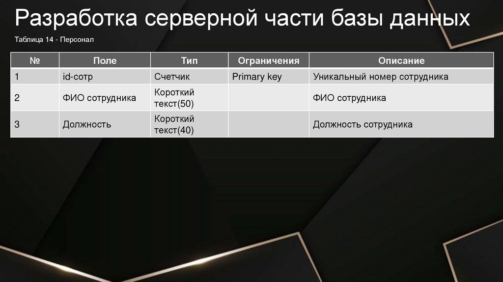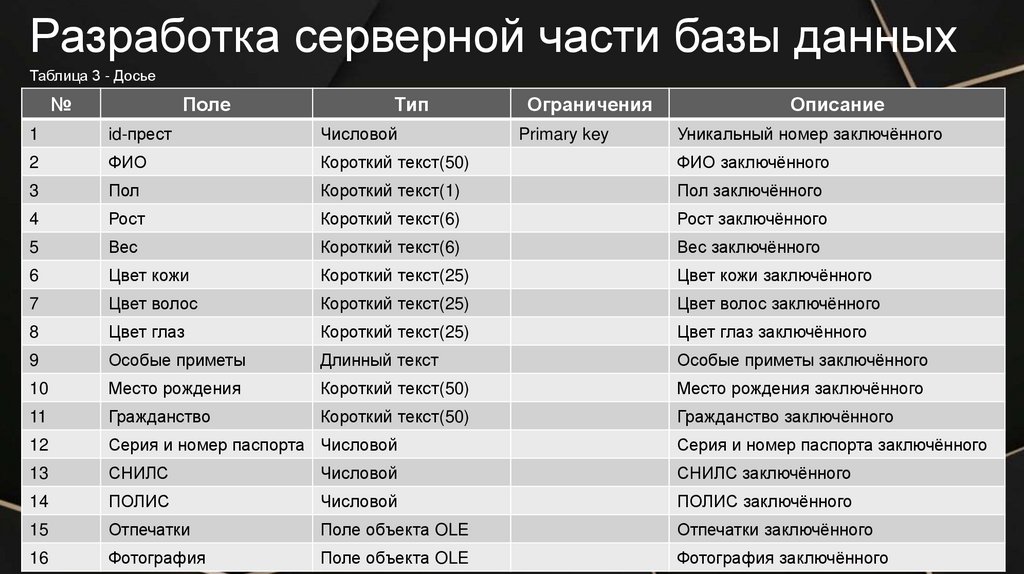 Разработка серверной части базы данныхТаблица 3 - Досье