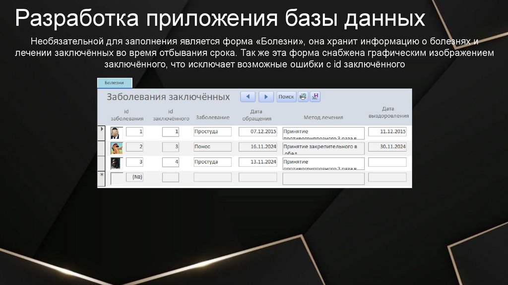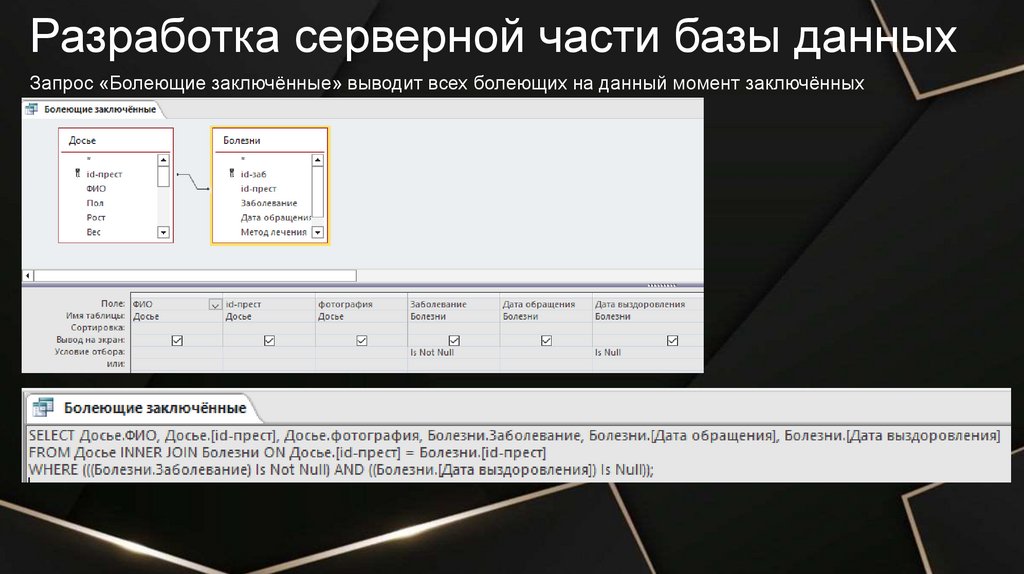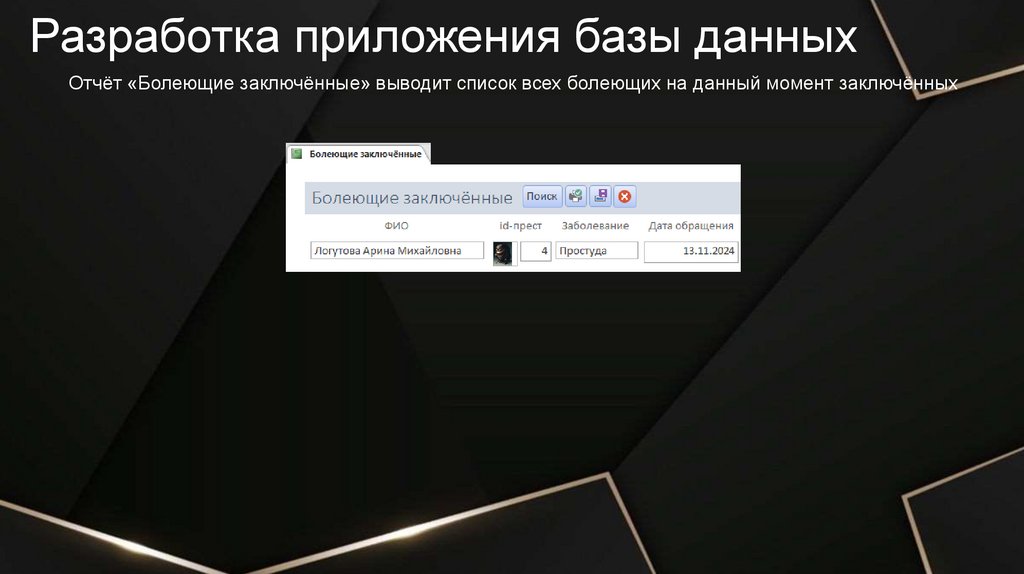 Разработка приложения базы данныхОтчёт «Болеющие заключённые» выводит список всех болеющих на данный момент заключённых