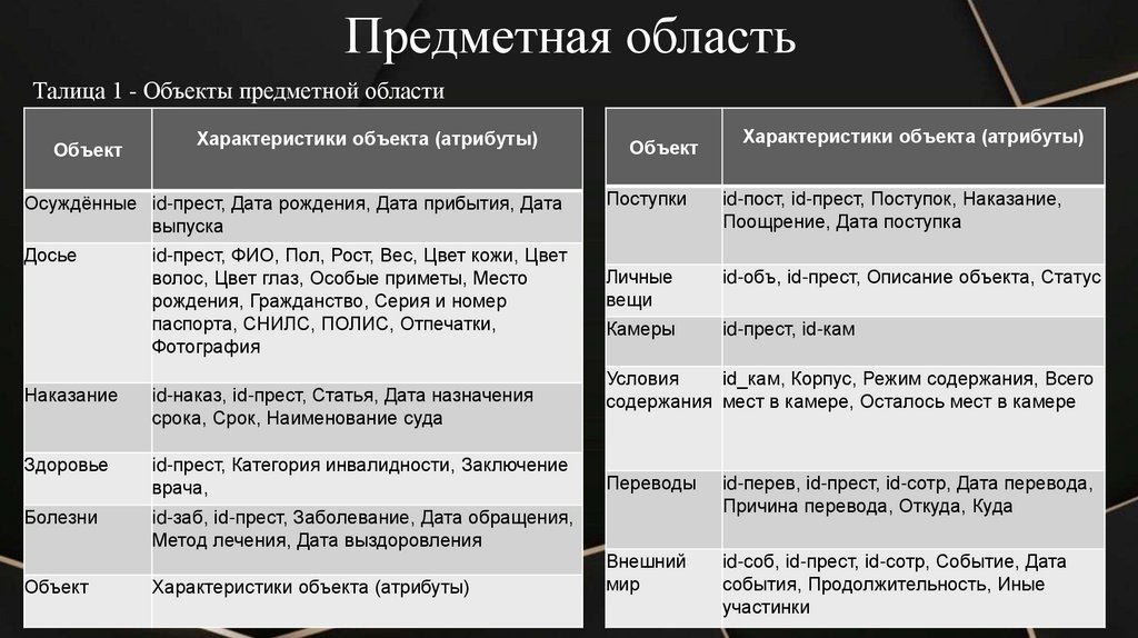 Предметная областьТалица 1 - Объекты предметной области