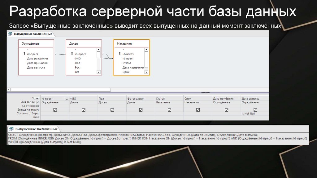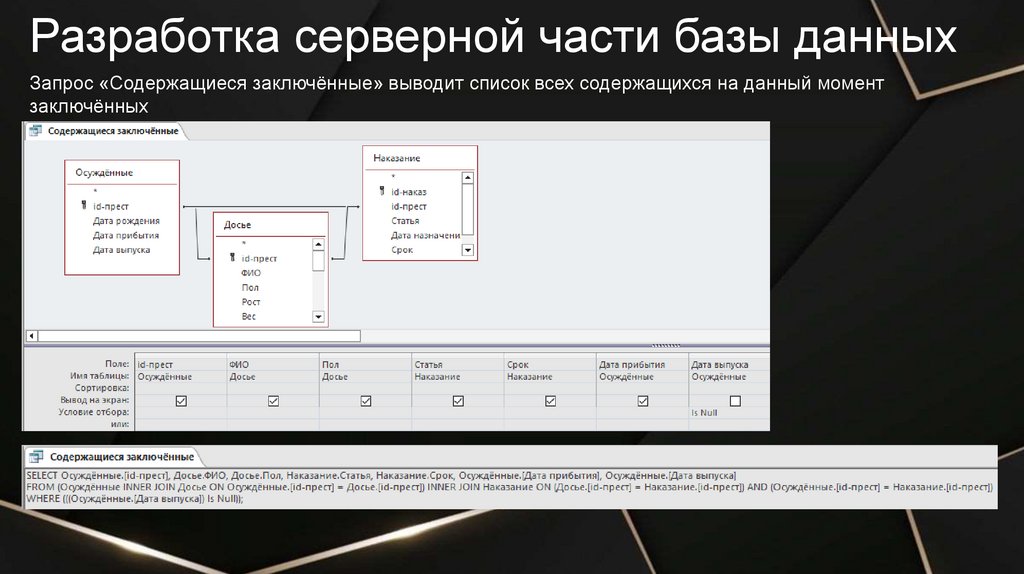 Разработка серверной части базы данныхЗапрос «Содержащиеся заключённые» выводит список всех содержащихся на данный момент