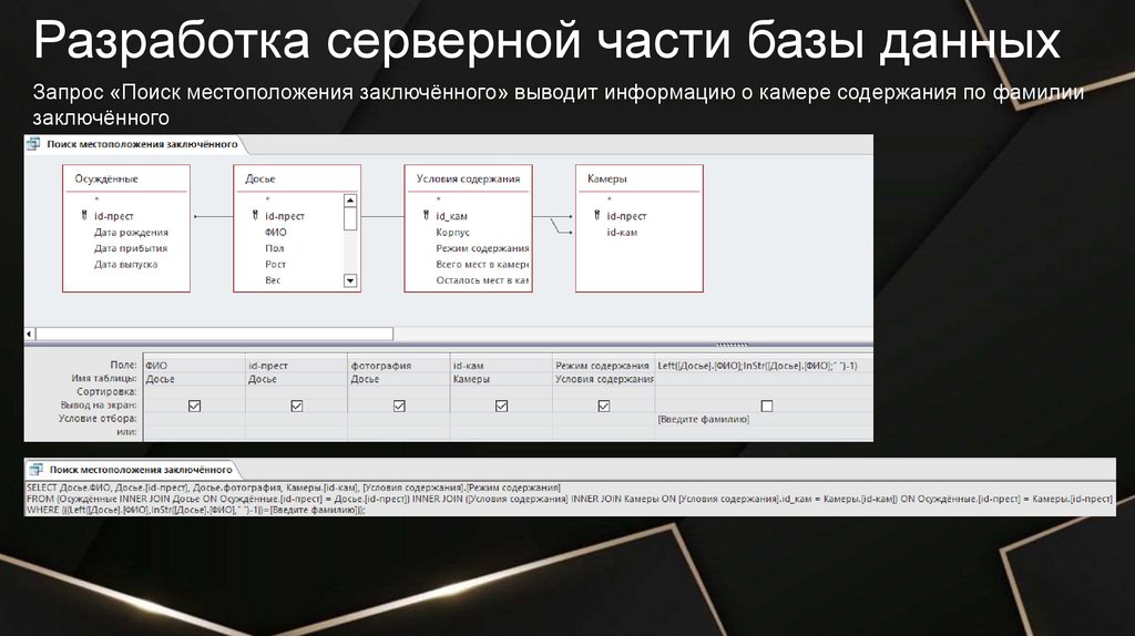 Разработка серверной части базы данныхЗапрос «Поиск местоположения заключённого» выводит информацию о камере содержания по фамилии