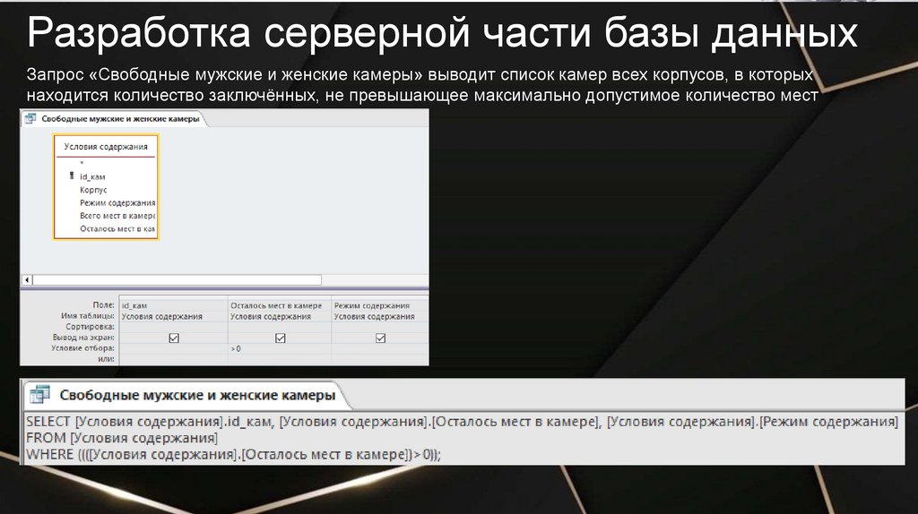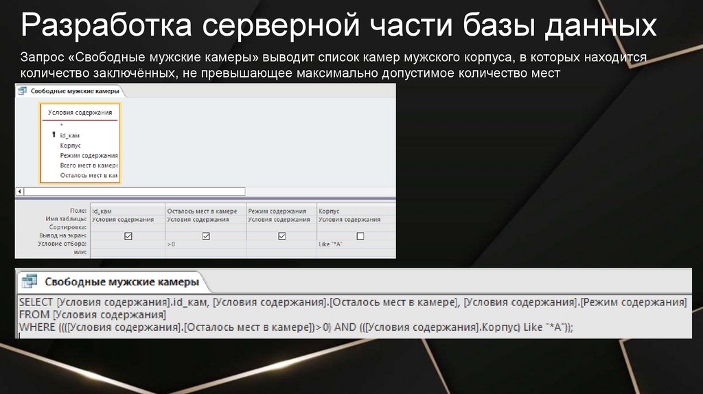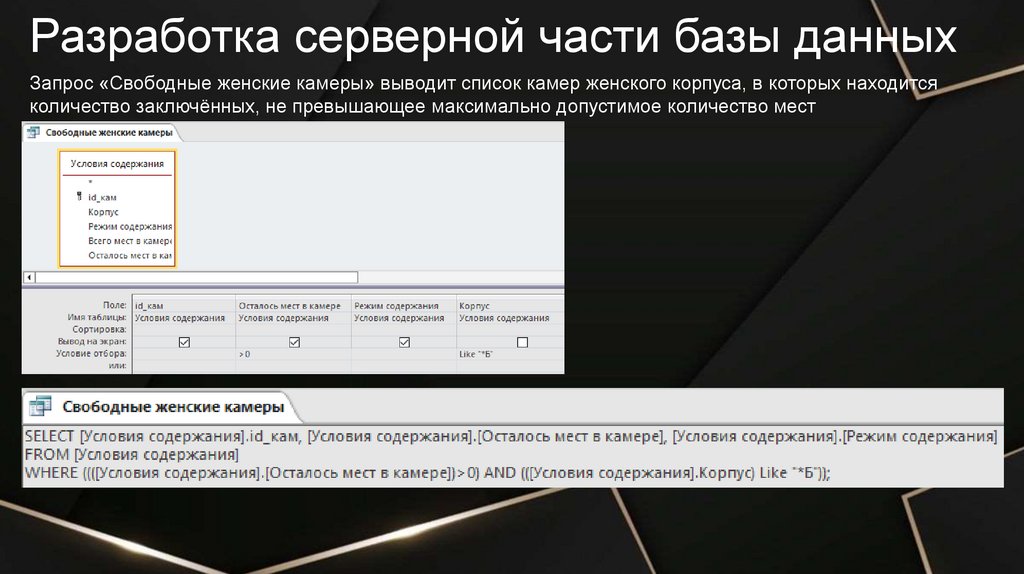 Разработка серверной части базы данныхЗапрос «Свободные мужские и женские камеры» выводит список камер всех корпусов, в которых