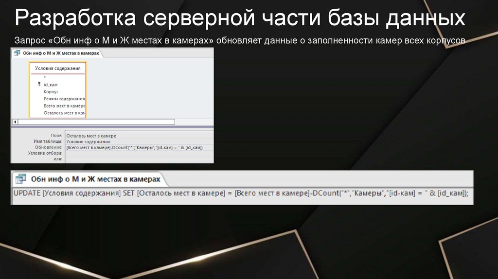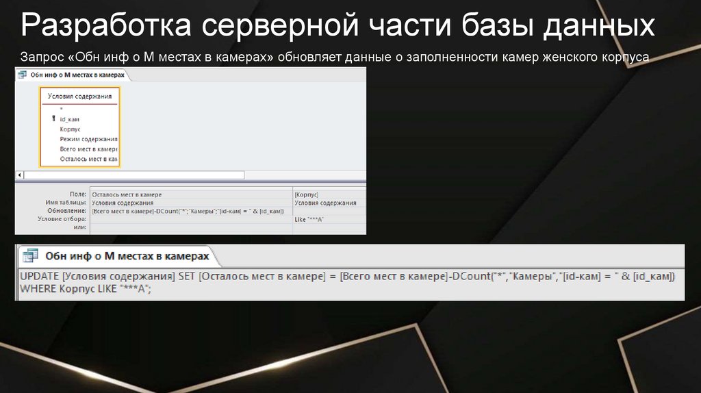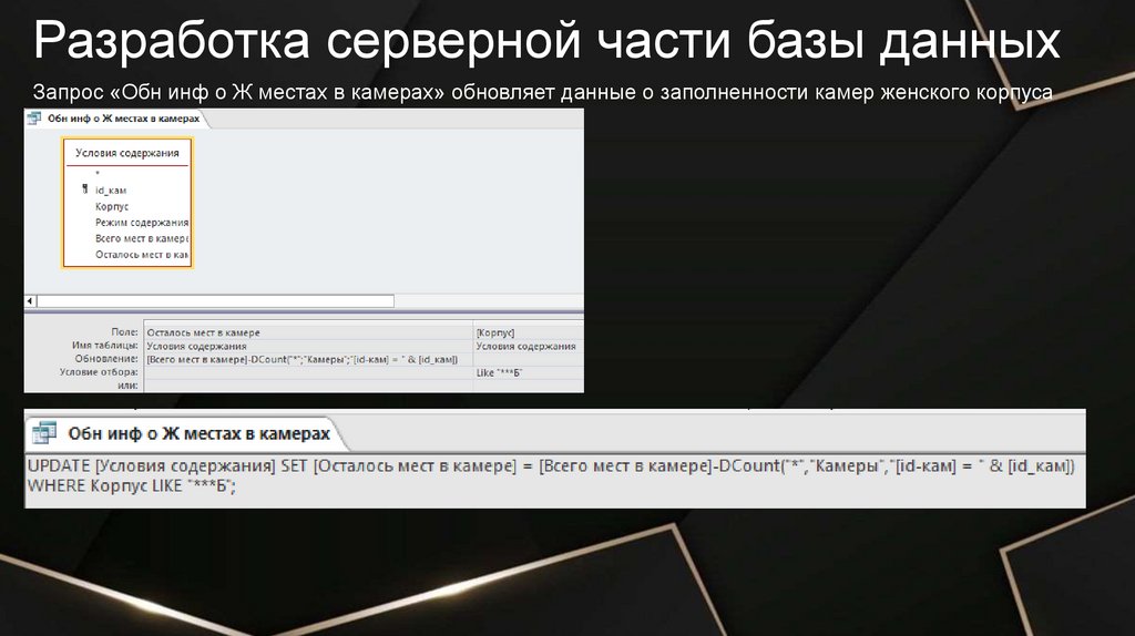 Разработка серверной части базы данныхЗапрос «Обн инф о М местах в камерах» обновляет данные о заполненности камер женского корпуса