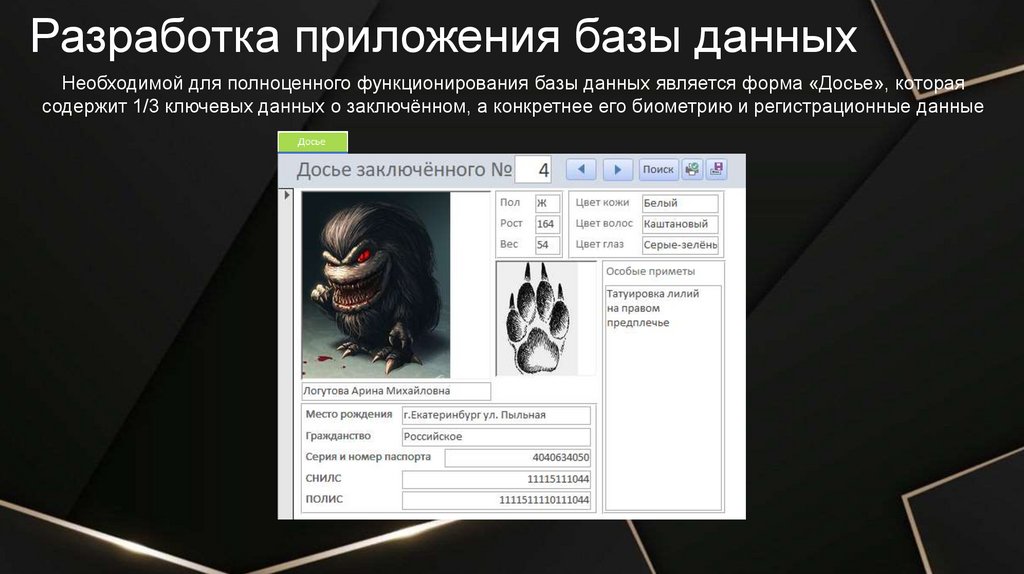 Разработка приложения базы данныхНеобходимой для полноценного функционирования базы данных является форма «Досье», которая