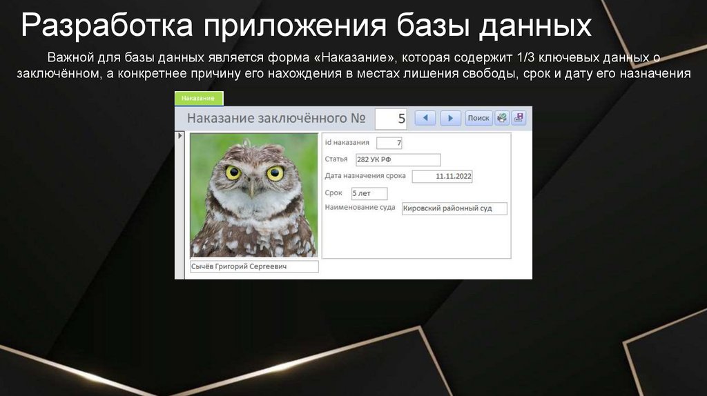 Разработка приложения базы данныхВажной для базы данных является форма «Наказание», которая содержит 1/3 ключевых данных о