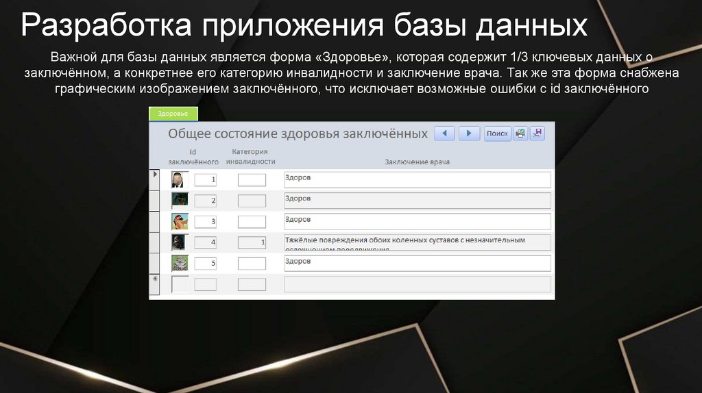 Разработка приложения базы данныхВажной для базы данных является форма «Здоровье», которая содержит 1/3 ключевых данных о