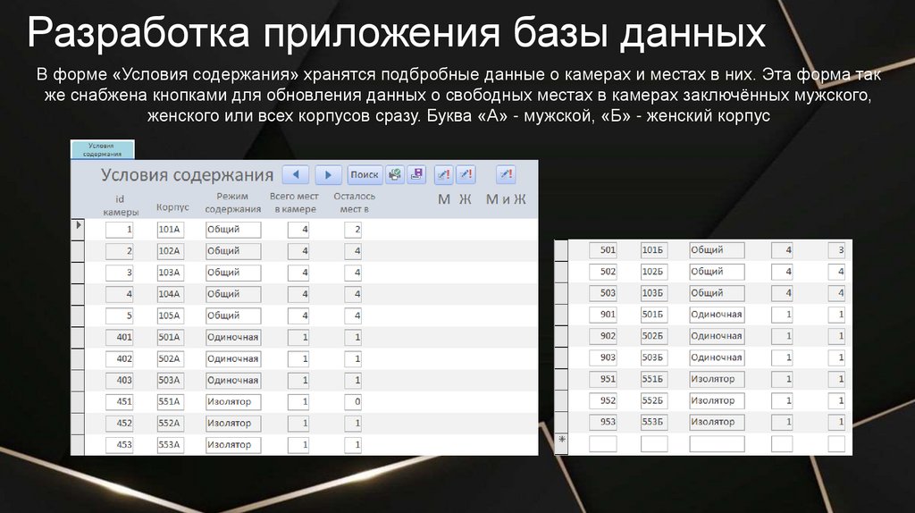 Разработка приложения базы данныхВ форме «Условия содержания» хранятся подбробные данные о камерах и местах в них. Эта форма так