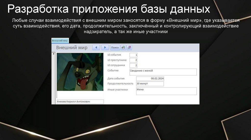 Разработка приложения базы данныхЛюбые случаи взаимодействия с внешним миром заносятся в форму «Внешний мир», где указывается