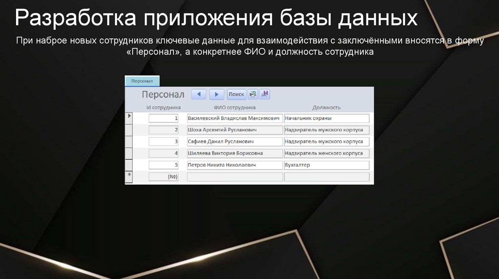 Разработка приложения базы данныхПри наброе новых сотрудников ключевые данные для взаимодействия с заключёнными вносятся в форму