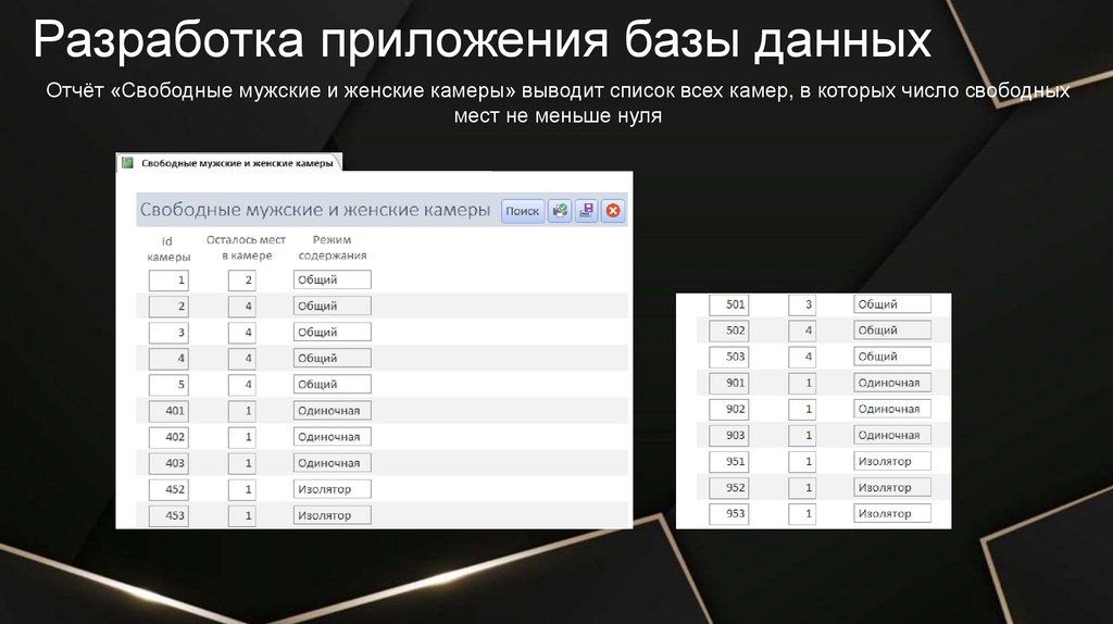Разработка приложения базы данныхОтчёт «Свободные мужские и женские камеры» выводит список всех камер, в которых число свободных