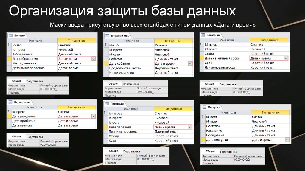 Организация защиты базы данныхМаски ввода присутствуют во всех столбцах с типом данных «Дата и время»