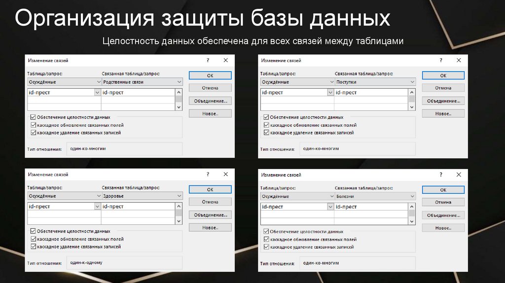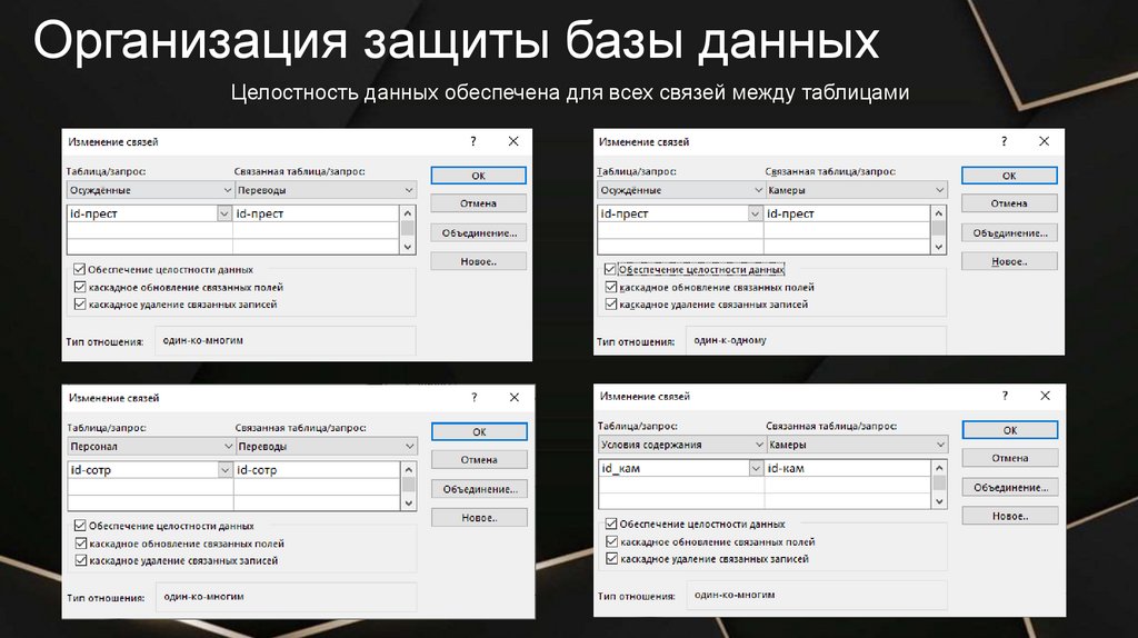 Организация защиты базы данныхЦелостность данных обеспечена для всех связей между таблицами