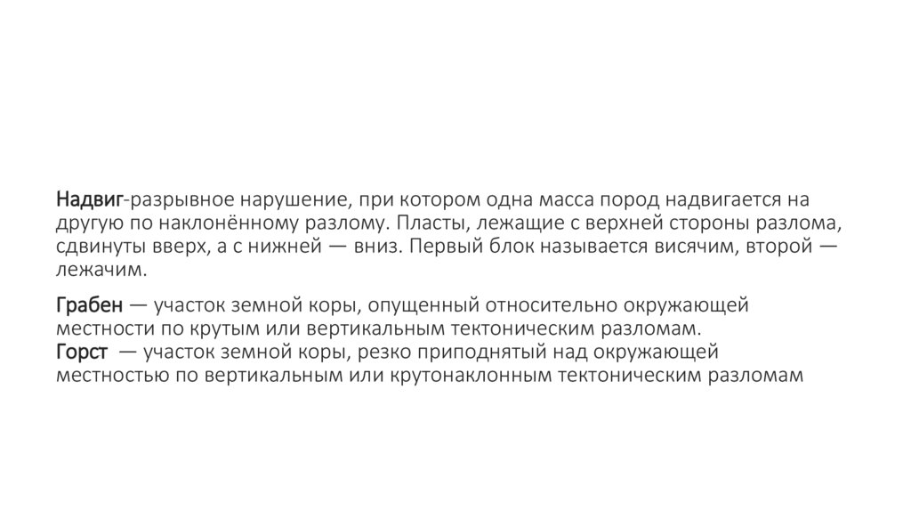 Надвиг-разрывное нарушение, при котором одна масса пород надвигается надругую по наклонённому разлому. Пласты, лежащие с верхней стороны разлома,