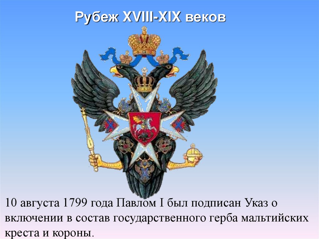 Рубеж XVIII-XIX веков10 августа 1799 года Павлом I был подписан Указ о