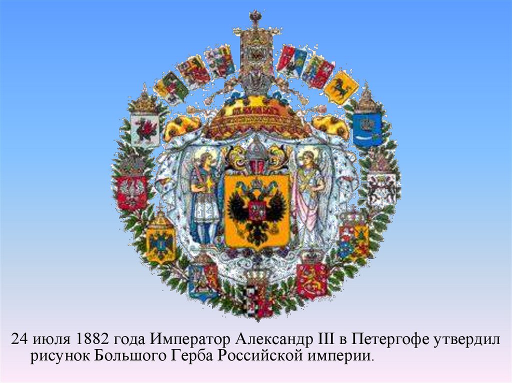 24 июля 1882 года Император Александр III в Петергофе утвердилрисунок Большого Герба Российской империи.