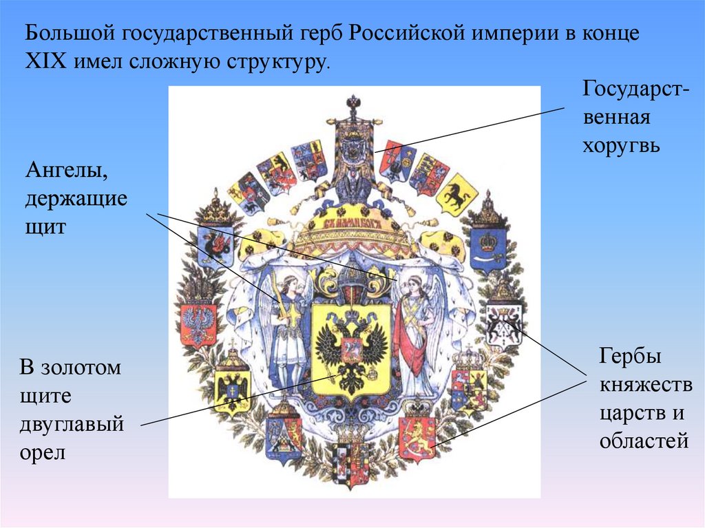 Большой государственный герб Российской империи в концеXIX имел сложную структуру.