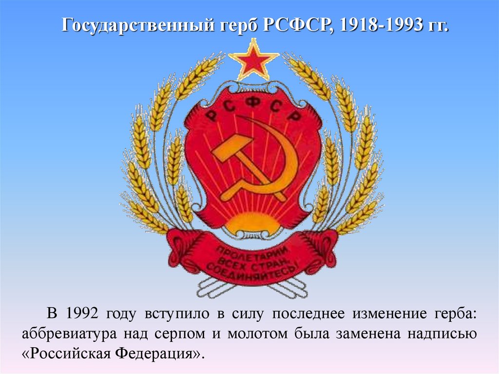 Государственный герб РСФСР, 1918-1993 гг.В 1992 году вступило в силу последнее изменение герба: