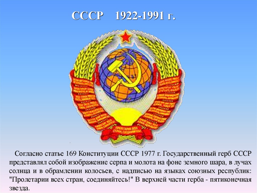 СССР 1922-1991 г.Согласно статье 169 Конституции СССР 1977 г. Государственный герб СССР