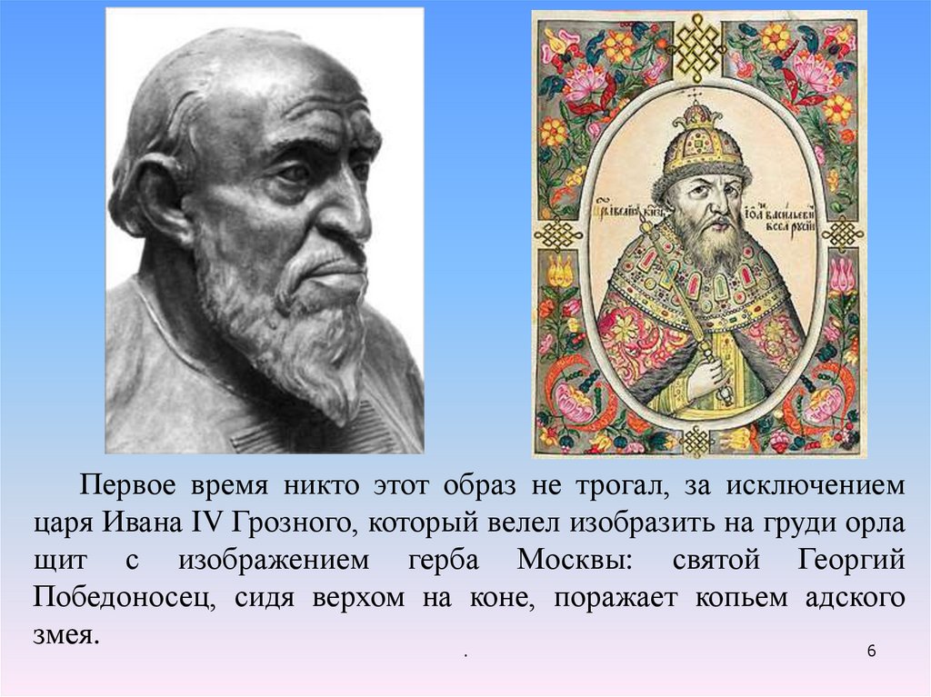 Первое время никто этот образ не трогал, за исключениемцаря Ивана IV Грозного, который велел изобразить на груди орла
