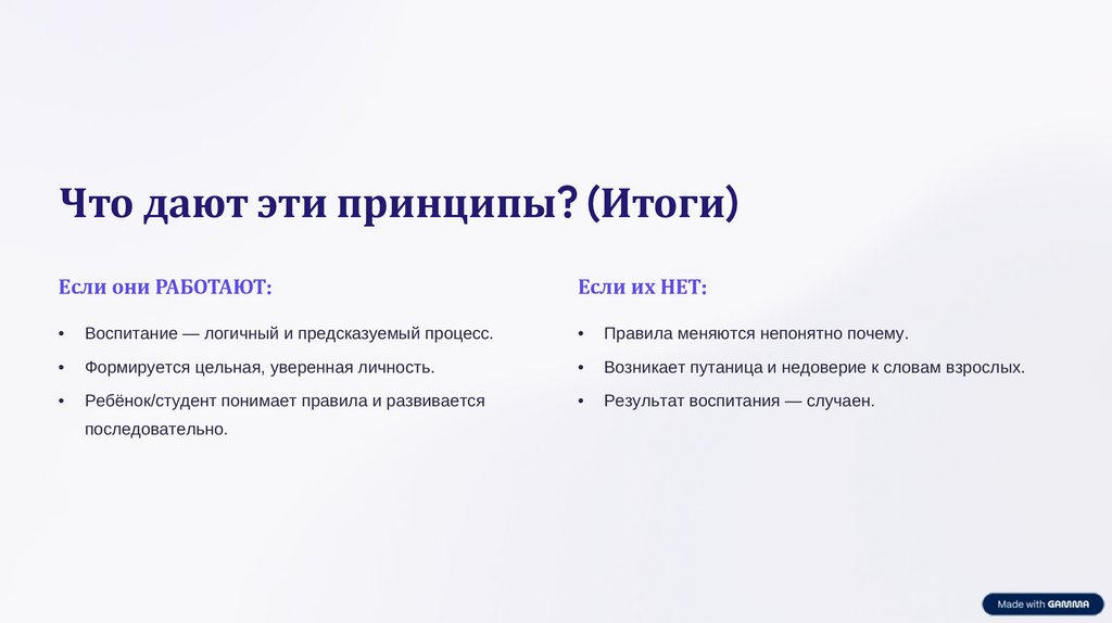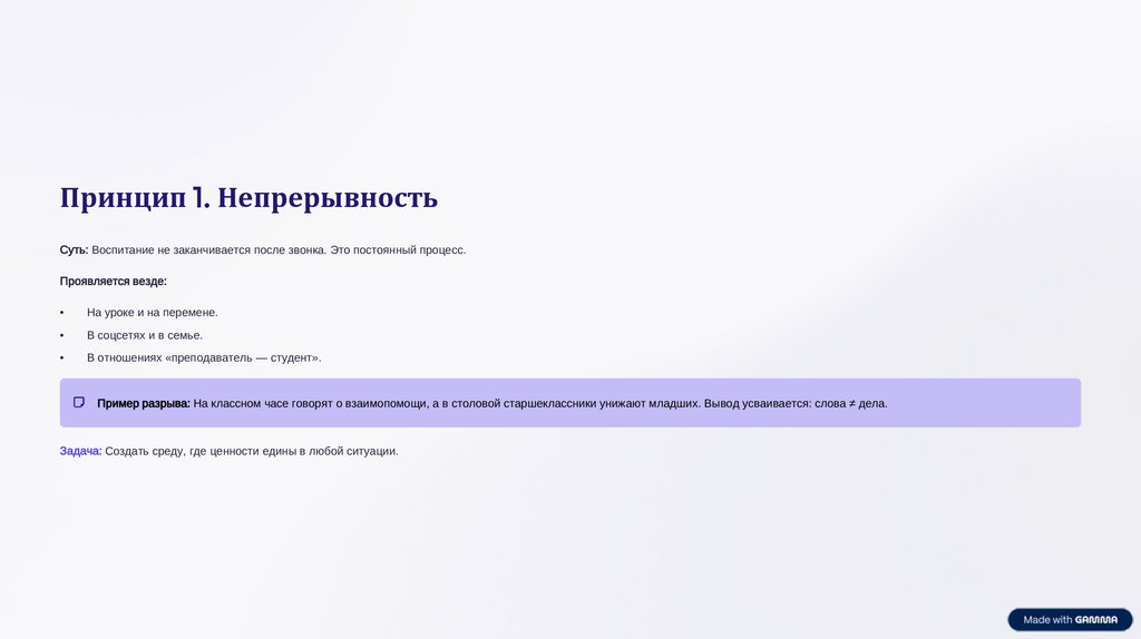 Принцип 1. НепрерывностьСуть: Воспитание не заканчивается после звонка. Это постоянный процесс.