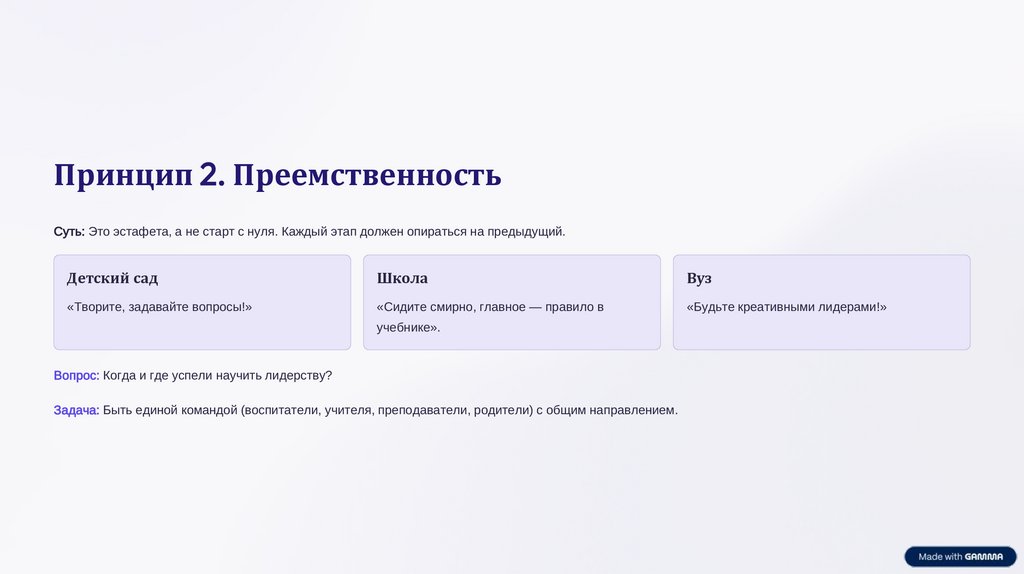 Принцип 2. ПреемственностьСуть: Это эстафета, а не старт с нуля. Каждый этап должен опираться на предыдущий.