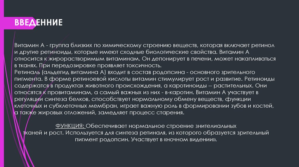 ВВЕДЕННИЕВитамин А - группа близких по химическому строению веществ, которая включает ретинол