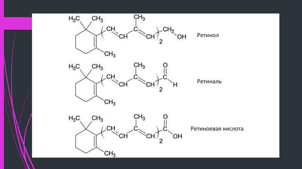 1. В организме ретинол превращается в ретиналь и ретиноевую кислоту, участвующие врегуляции ряда функций (в росте и дифференцировке клеток); они также составляют