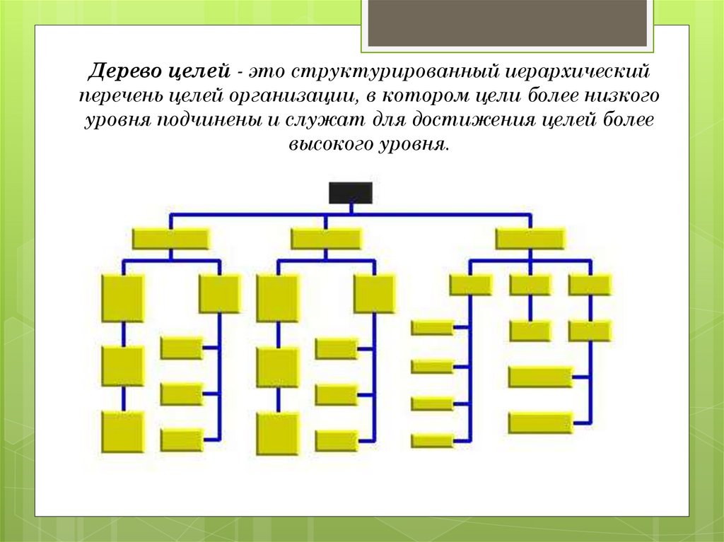 Дерево целей - это структурированный иерархическийперечень целей организации, в котором цели более низкого