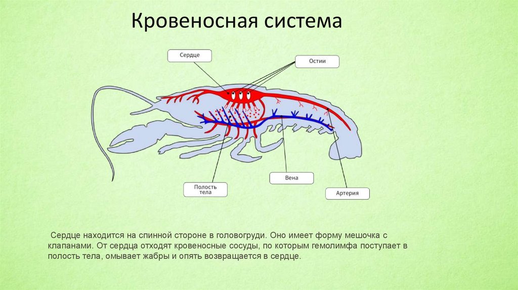 Кровеносная системаСердце находится на спинной стороне в головогруди. Оно имеет форму мешочка с