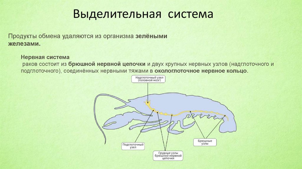 раков состоит из брюшной нервной цепочки и двух крупных нервных узлов (надглоточного и