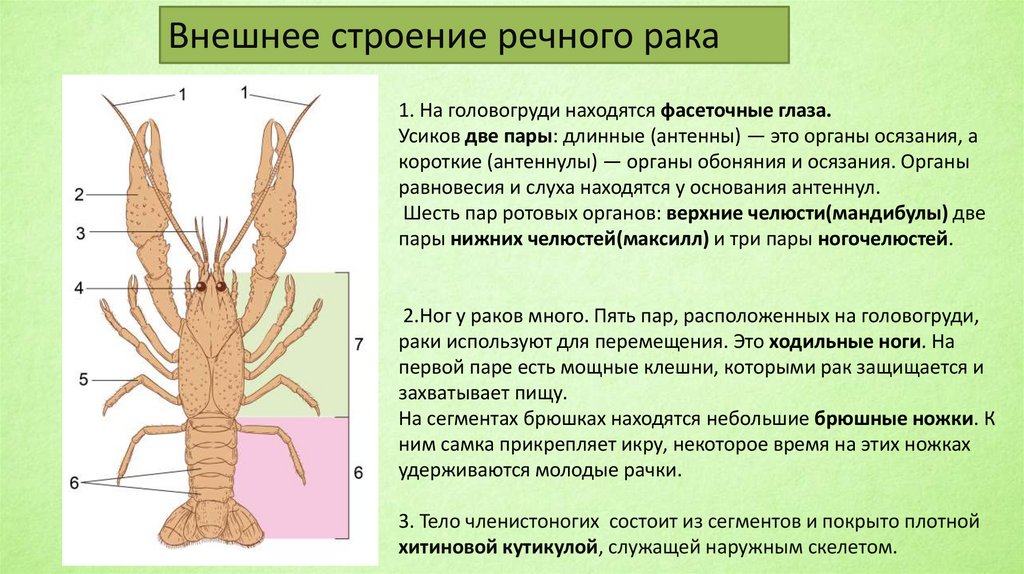 Внешнее строение речного рака1. На головогруди находятся фасеточные глаза.