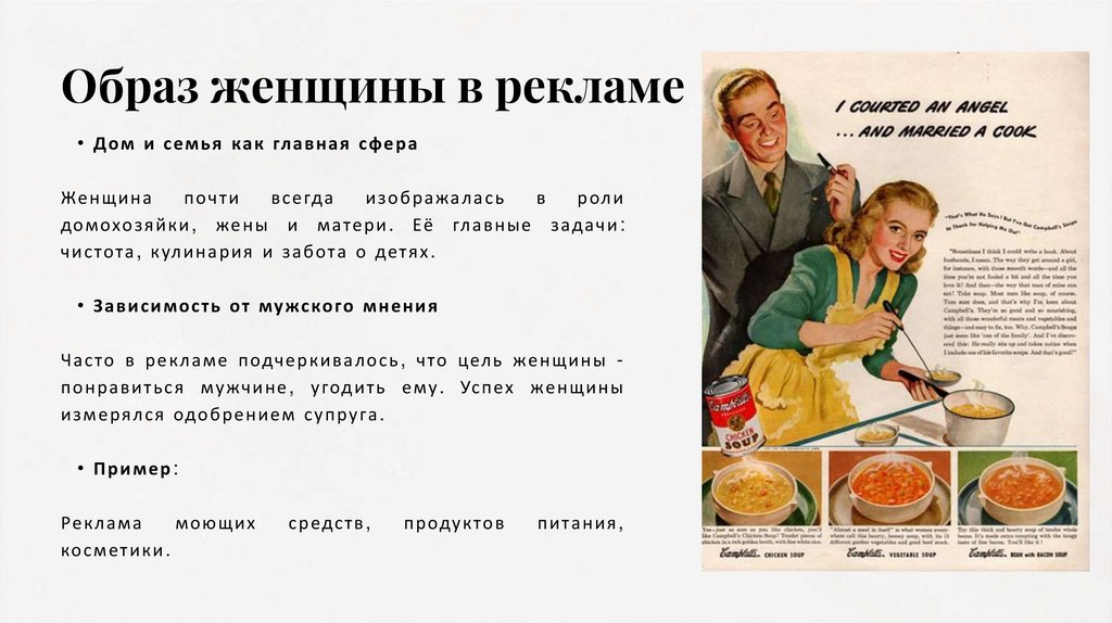 Ч а сто в ре кл а ме подче ркив а ло сь , что цель же нщ ины по нра в ить с я мужч ине , угодит ь ему. Успех же нщ ины