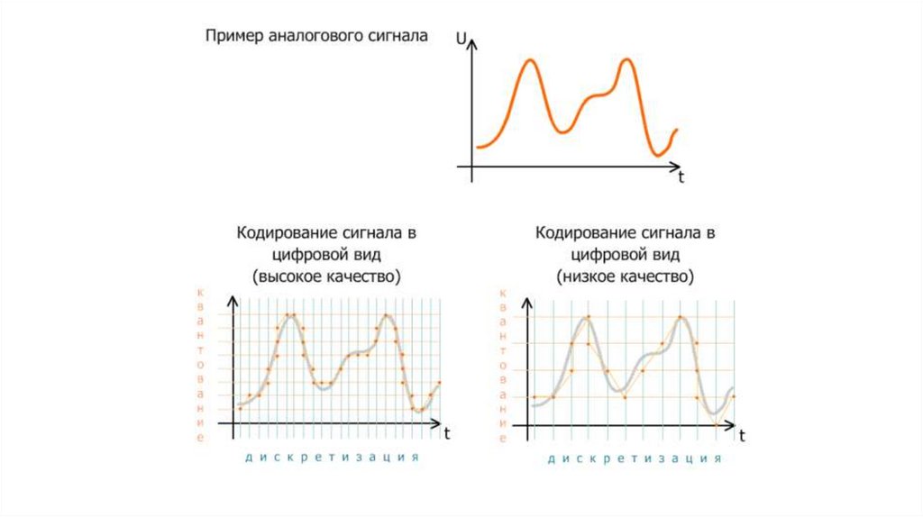 Частота дискретизации - сколько раз в секунду будет измерен сигнал.Разрядность дискретизации сколько выделено бит для каждого