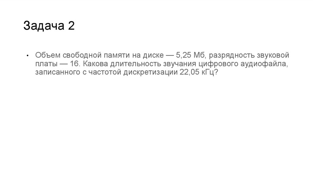 Задача 2Объем свободной памяти на диске — 5,25 Мб, разрядность звуковой