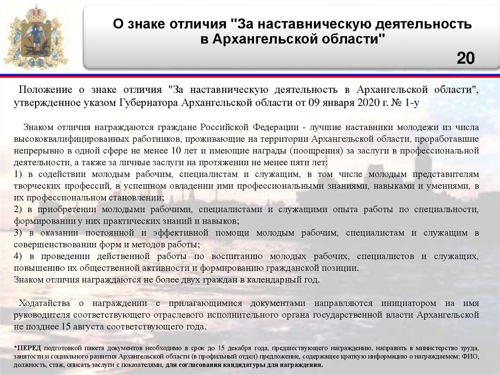 Положение о знаке отличия "За наставническую деятельность в Архангельской области",
