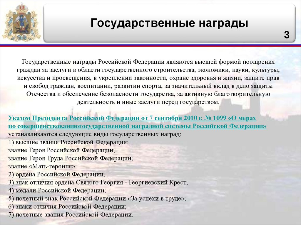 Государственные награды Российской Федерации являются высшей формой поощрения