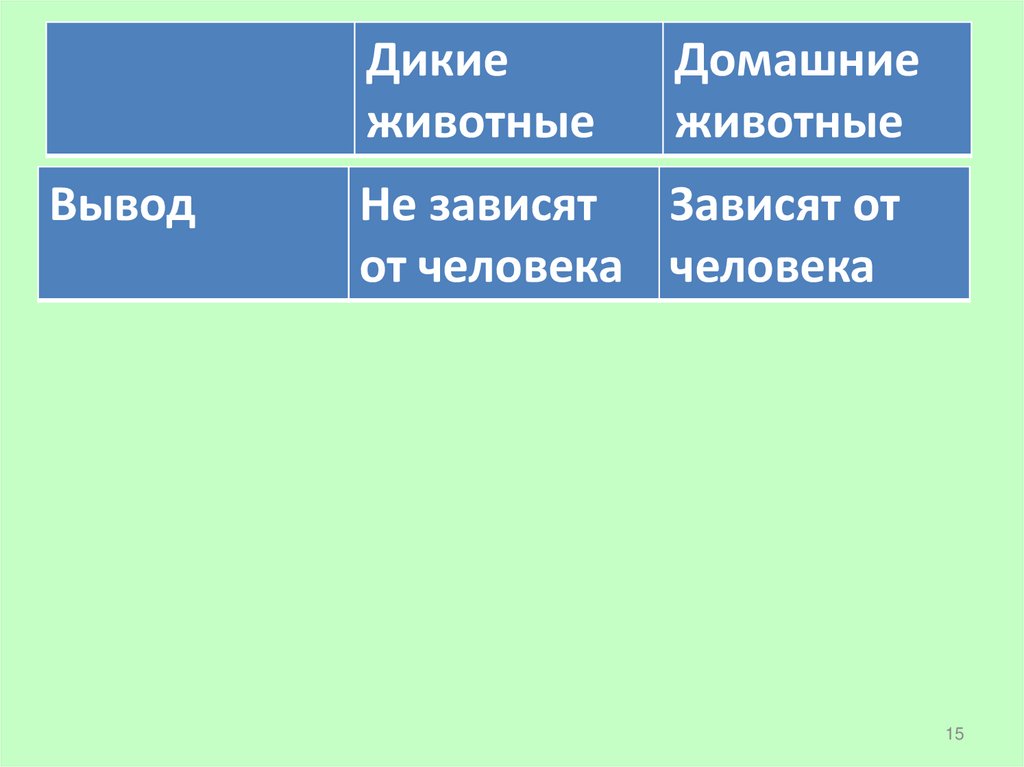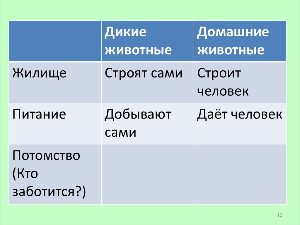 • Домашних животных разводят люди. Людикормят их и защищают, строят для них жилища,