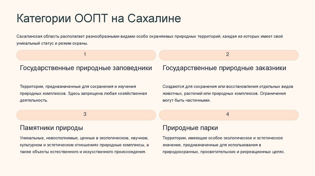 Категории ООПТ на СахалинеСахалинская область располагает разнообразными видами особо охраняемых природных территорий, каждая из которых имеет свой