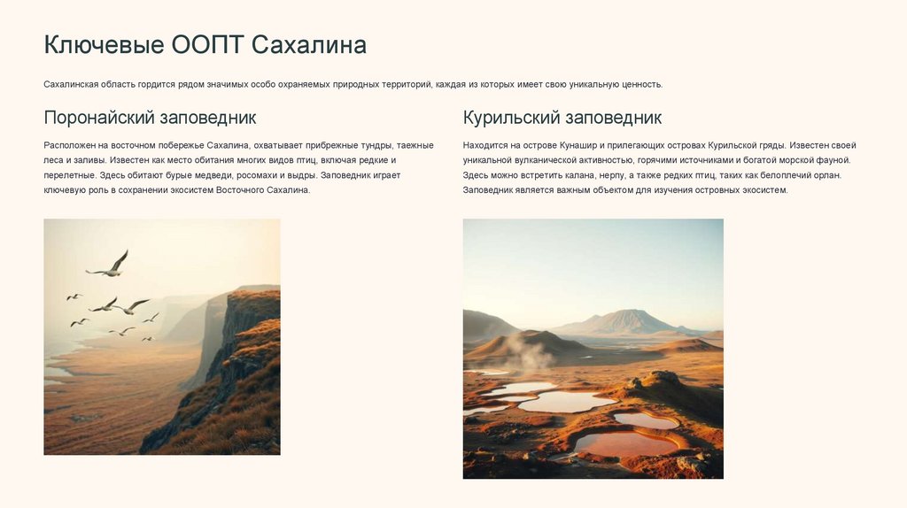 Ключевые ООПТ СахалинаСахалинская область гордится рядом значимых особо охраняемых природных территорий, каждая из которых имеет свою уникальную ценность.