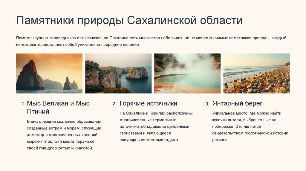 Памятники природы Сахалинской областиПомимо крупных заповедников и заказников, на Сахалине есть множество небольших, но не менее значимых памятников природы, каждый