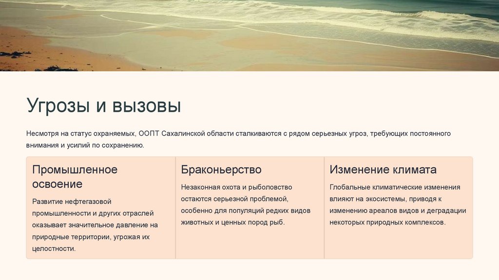 Угрозы и вызовыНесмотря на статус охраняемых, ООПТ Сахалинской области сталкиваются с рядом серьезных угроз, требующих постоянного