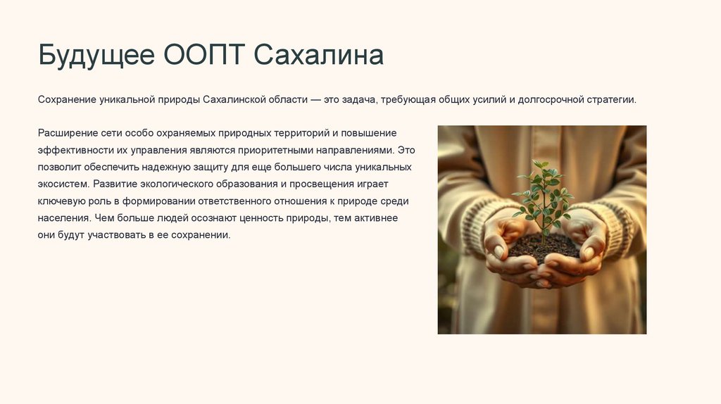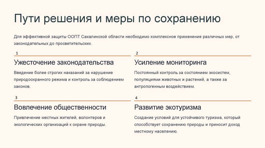 Пути решения и меры по сохранениюДля эффективной защиты ООПТ Сахалинской области необходимо комплексное применение различных мер, от