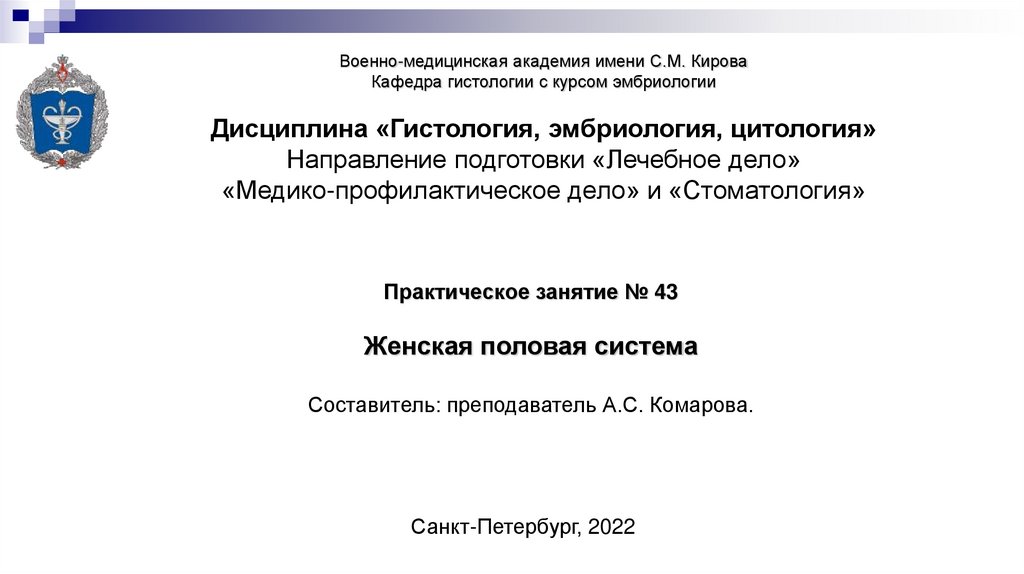 1. Практическое занятие № 43 Женская половая система Составитель: преподаватель А.С. Комарова.