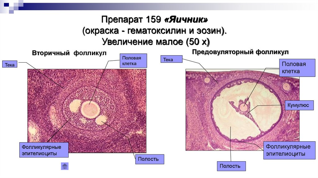 первичные, вторичные, третичные и зрелые (предовуляторные) фолликулы яичника, отметитьпервичные овоциты (овоциты 1-го порядка), прозрачную оболочку, фолликулярные эпителиоциты,