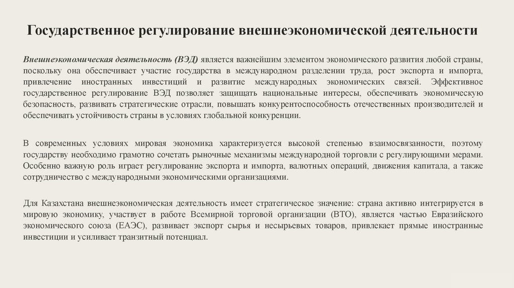 Государственное регулирование внешнеэкономической деятельностиВнешнеэкономическая деятельность (ВЭД) является важнейшим элементом экономического развития любой страны,