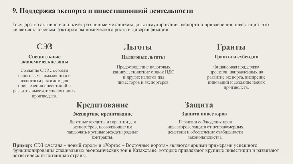 9. Поддержка экспорта и инвестиционной деятельностиГосударство активно использует различные механизмы для стимулирования экспорта и привлечения инвестиций, что
