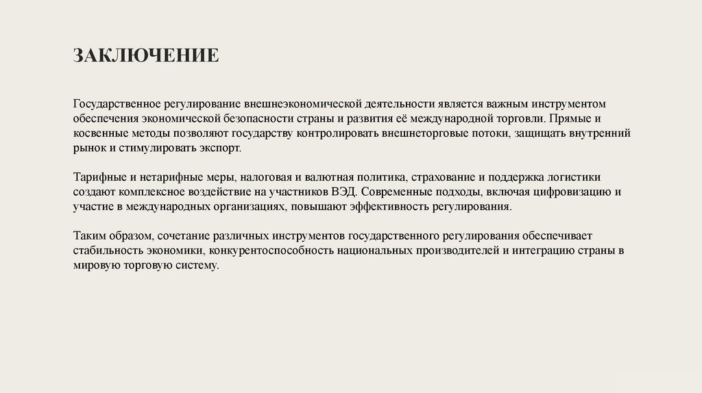 ЗАКЛЮЧЕНИЕГосударственное регулирование внешнеэкономической деятельности является важным инструментом