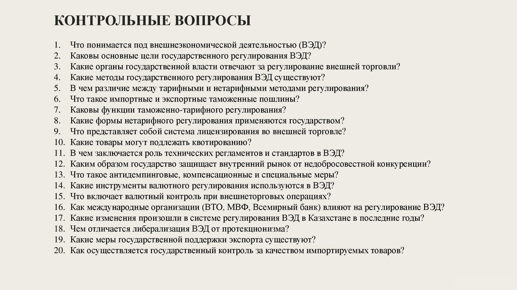 КОНТРОЛЬНЫЕ ВОПРОСЫ1. Что понимается под внешнеэкономической деятельностью (ВЭД)?