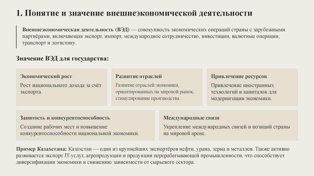 1. Понятие и значение внешнеэкономической деятельностиВнешнеэкономическая деятельность (ВЭД) — совокупность экономических операций страны с зарубежными